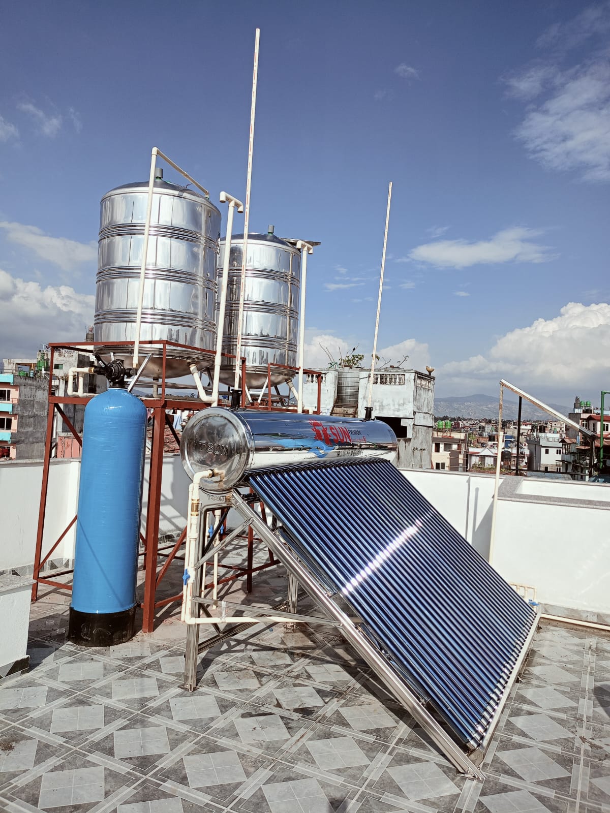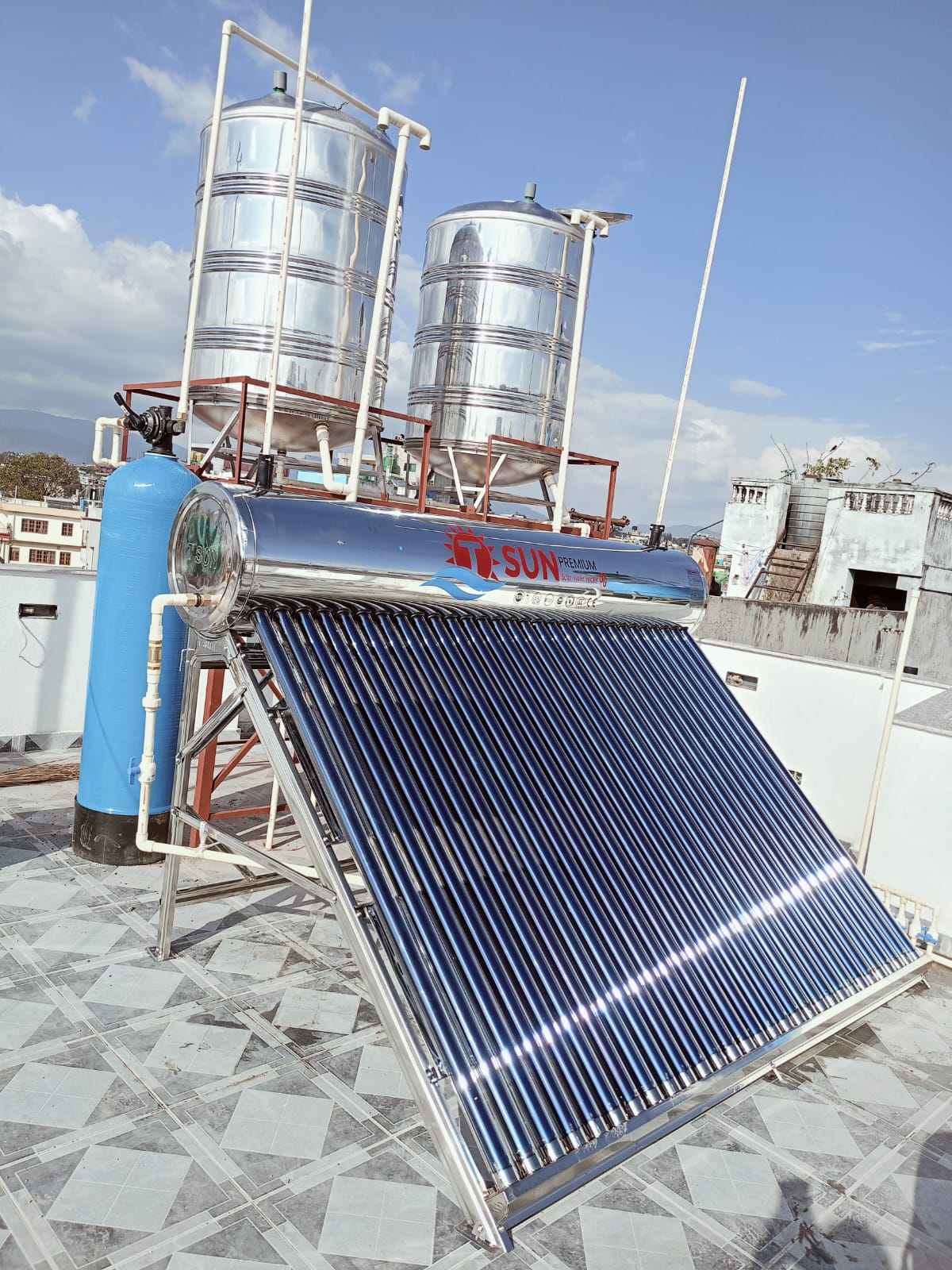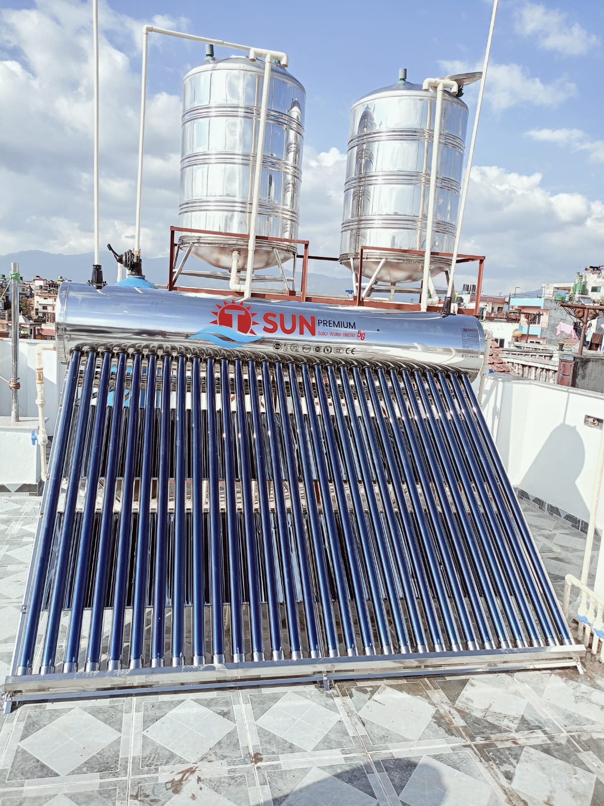 The TSun Solar Water Heater, offered by Multi Power Solution, is a high-capacity and highly durable solar heating system built to deliver reliable, energy-efficient hot water for residential and commercial needs. It’s designed with top-tier materials and thoughtful engineering to perform excellently across Nepal’s climate—whether in the blistering sun, monsoon rains, or chilly winters.